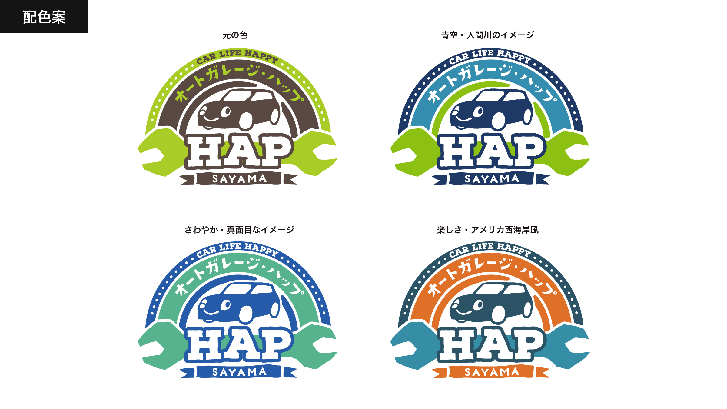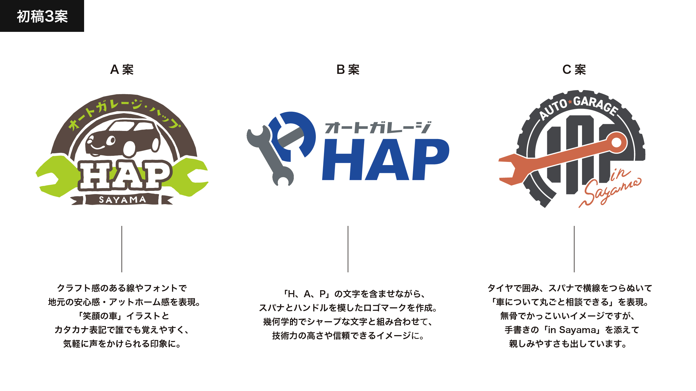 C案は、タイヤで「HAP」を囲み、スパナで横線をつらぬくことで「車について丸ごと相談できる」を表しました。無骨でかっこいいイメージですが、手書きの「in Sayama」を添えることで親しみやすさも出しています。