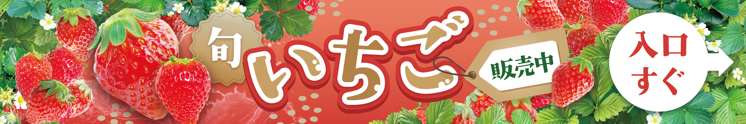 赤いいちごと緑の葉のコントラストを生かし、「旬」「販売中」のあしらいや「いちご」の文字に立体感を持たせることで、いちごのコロっとした可愛さや新鮮さ・直売感を表現しています。POPな赤色で最初にドライバーの目を引く役割も持っています。