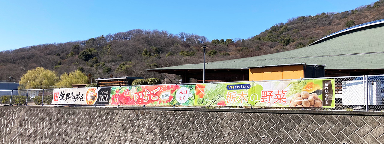 栃木県栃木市にある「道の駅みかも」さんにて掲出する、集客用のタペストリー・横断幕あわせて5種のデザイン制作をさせていただきました。
