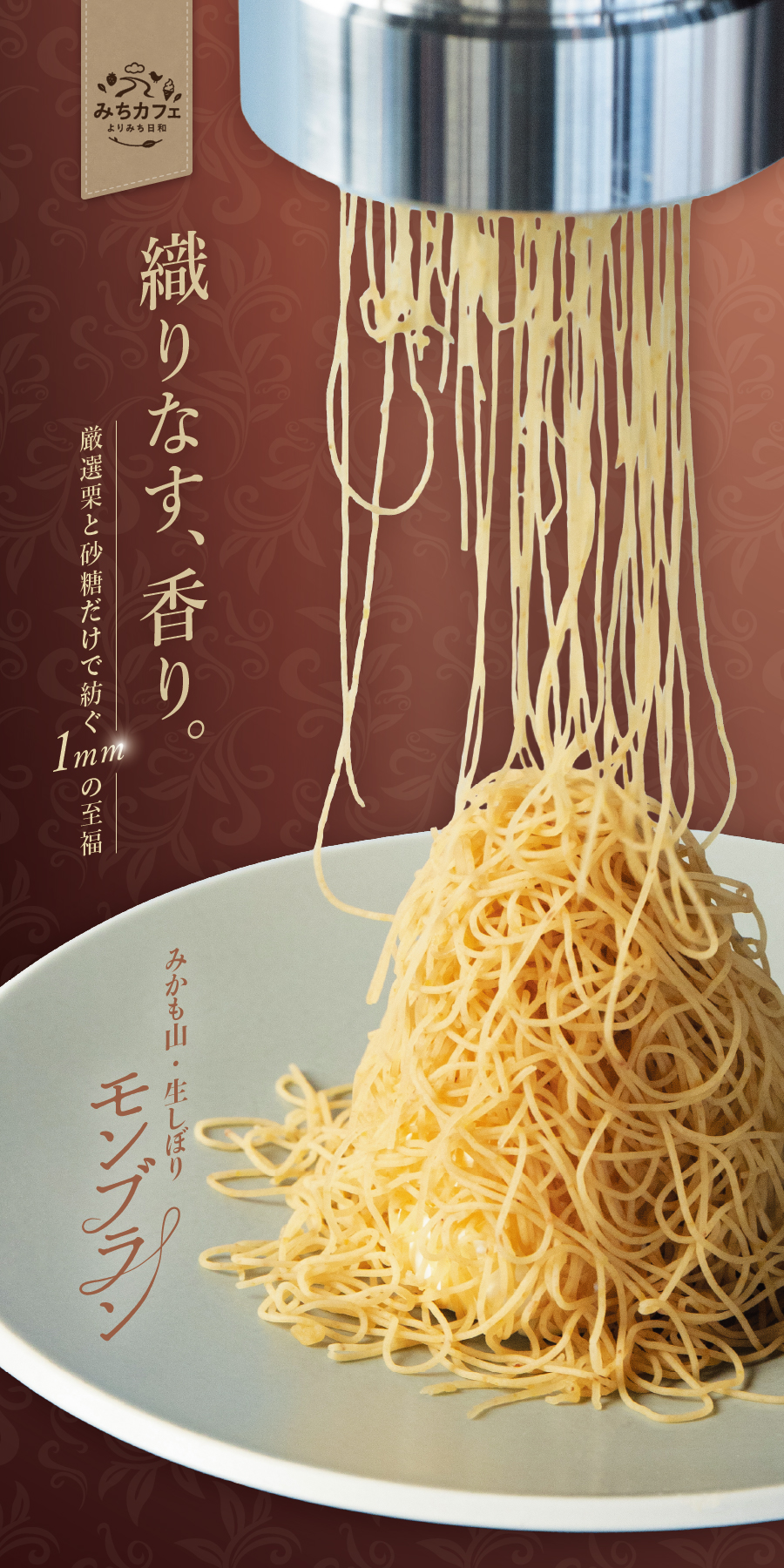 また「上品さ・香りのマリアージュ」をより伝えるため、「1mm極細」「原料は栗・砂糖だけ」という商品情報と合わせて、キャッチコピー「織りなす、香り。厳選栗と砂糖だけで紡ぐ1mmの至福」を作成しました。